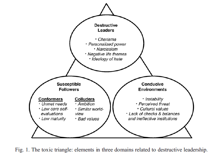 Padilla et al’s toxic triangle illustrates the elements related to destructive leadership.